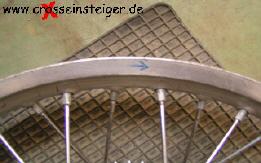 Der erste Reifenhalter ist lose in der Felge montiert. Die Felge wird mit der Bremsscheibenseite voraus in den Reifen gestellt, damit bei der späteren Montage das Kettenblatt unten liegt und man sich, im Falle eines Abrutschens, nicht daran verletzen kann. |