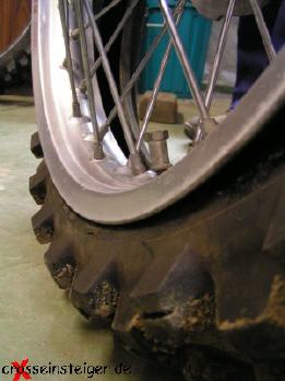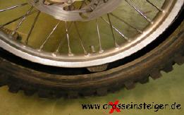 ... so dass der Reifen so tief wie möglich im Felgenbett steht. (Wichtig) Dann wird das ganze mit der offenen Seite (Bremsscheibe) nach oben auf den Boden gelegt |