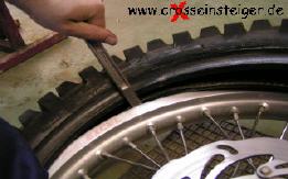 Beim Einfädeln des Reifenhaltergewindes in das Loch der Felge ist es hilfreich, mit einer Hand auf den Halter zu drücken und von der anderen Seite mit dem Montiereisen den Reifen etwas nach oben zu hebeln, so dass man mehr Raum zum Einfädeln bekommt. |