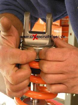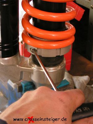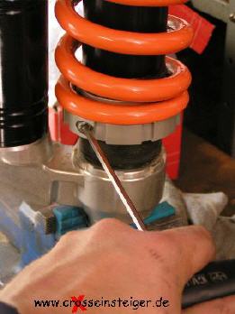 Die Konterschraube der Vorspannmutter lösen. Bei manchen Dämpfern werden 2 Muttern gegeneinander gekonntert. |