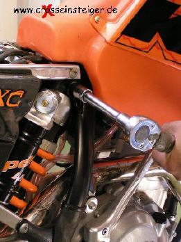 Die Vorspannmutter komplett nach unten schrauben. Dazu einen Hakenschlüssel verwenden… |