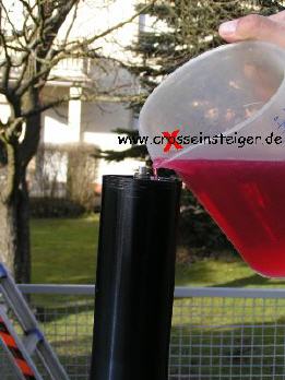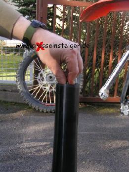 Wenn sich Deine Kolbenstange ohne Widerstand pumpen läßt und kein Öl mehr aus dem Cartridge kommt, kannst Du das neue Öl einfüllen. Dazu fixierst Du die Gabel und drückst das Außenrohr wieder vollständig herunter. |