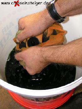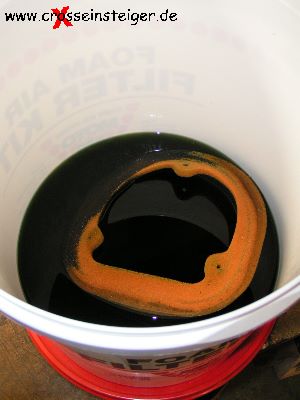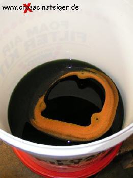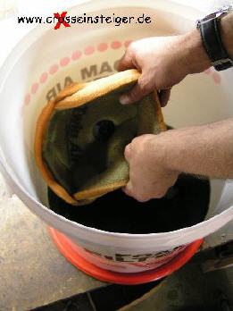 Den Luftfilter jetzt im Reiniger einweichen. Je nach Verschmutzung muß der Reiniger etwas einwirken. |