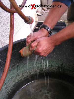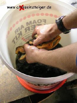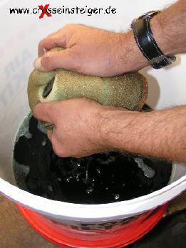 Ist der Filter im Reiniger sauber ausgewaschen, muß jetzt der Reiniger aus dem Filter gewaschen werden. Das ist notwendig, da der Reiniger das Filteröl löst. Reste des Reinigers würden dafür sorgen, daß das Öl nicht im Filter bleibt. Am Besten unter fließendem Wasser auswaschen. |